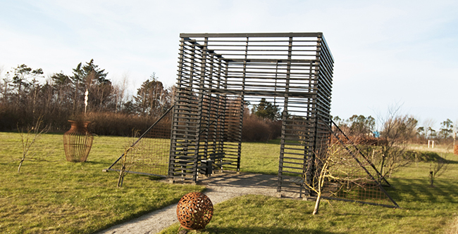 Det er parkens indgangsparti og to andre værker, en boldt og en store vase i jern, som med deres behandling af vejrliget, tager sig smukt ud i det grønne område.