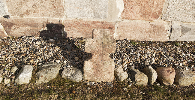 Korset, der er fundet i kirkens gulv, er nu anbragt ved kirkens vestgavl.