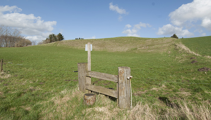 Parker ved kirken og gå op på højen. Her lå kilden, som i dag ses som en svag lidt fugtig sænkning i højen.